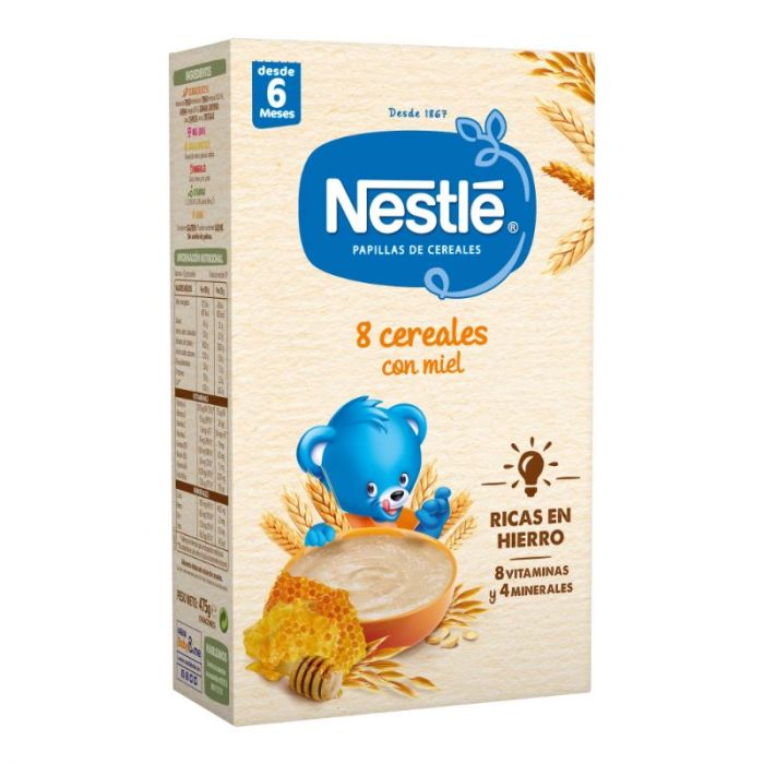 La Papilla Nestlé 8 Cereales con Miel 475 g combina una variedad de cereales con miel natural, aportando energía y sabor. Rica en hierro, calcio y vitaminas, es ideal para complementar la alimentación del bebé desde los 6 meses.