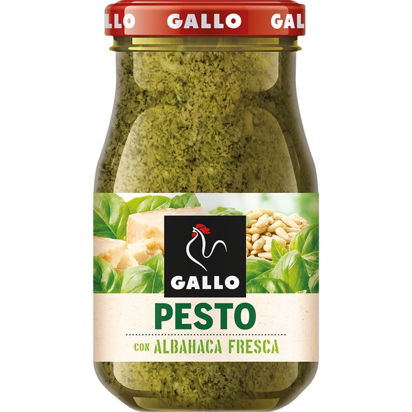 Salsa pesto Gallo con albahaca fresca y queso, frasco de 190g.